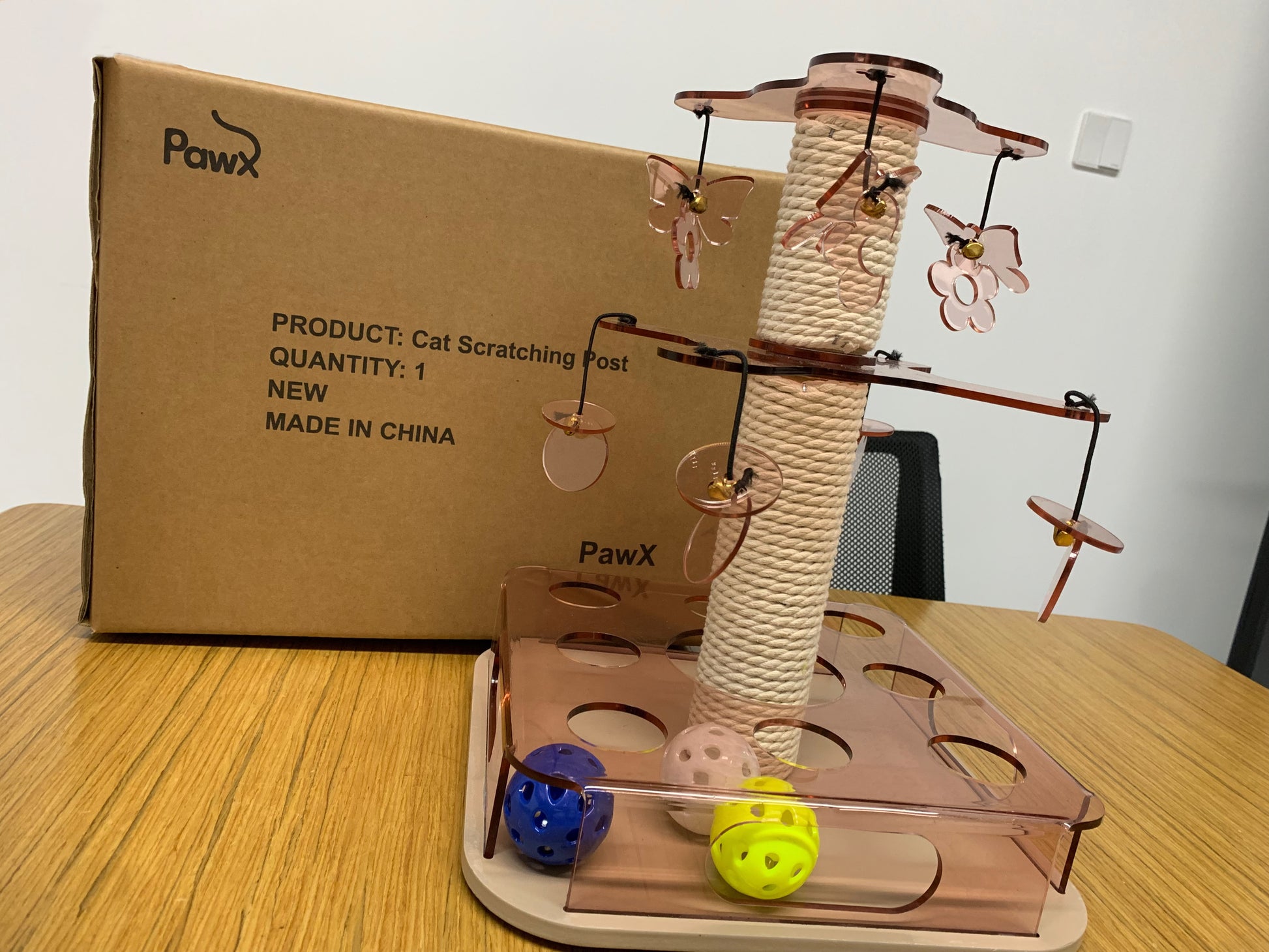 PawX Modern Aesthetic Cat Scratching Post for Indoor Cats with Interactive Cat Toy, 2-Layer Spinning Teaser Disc with Dangling Toys, Acrylic, Pink